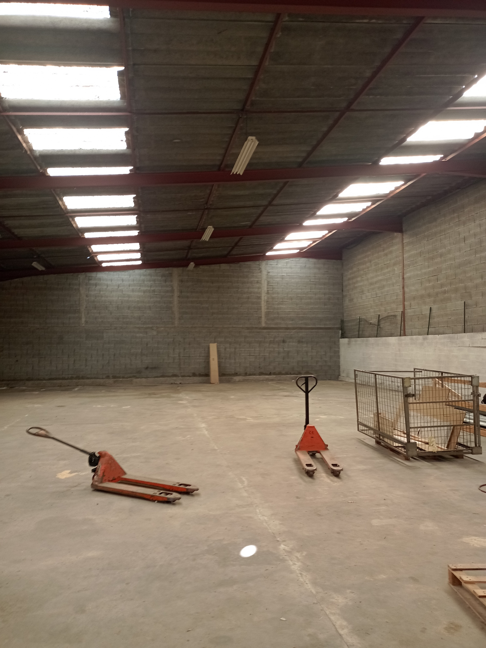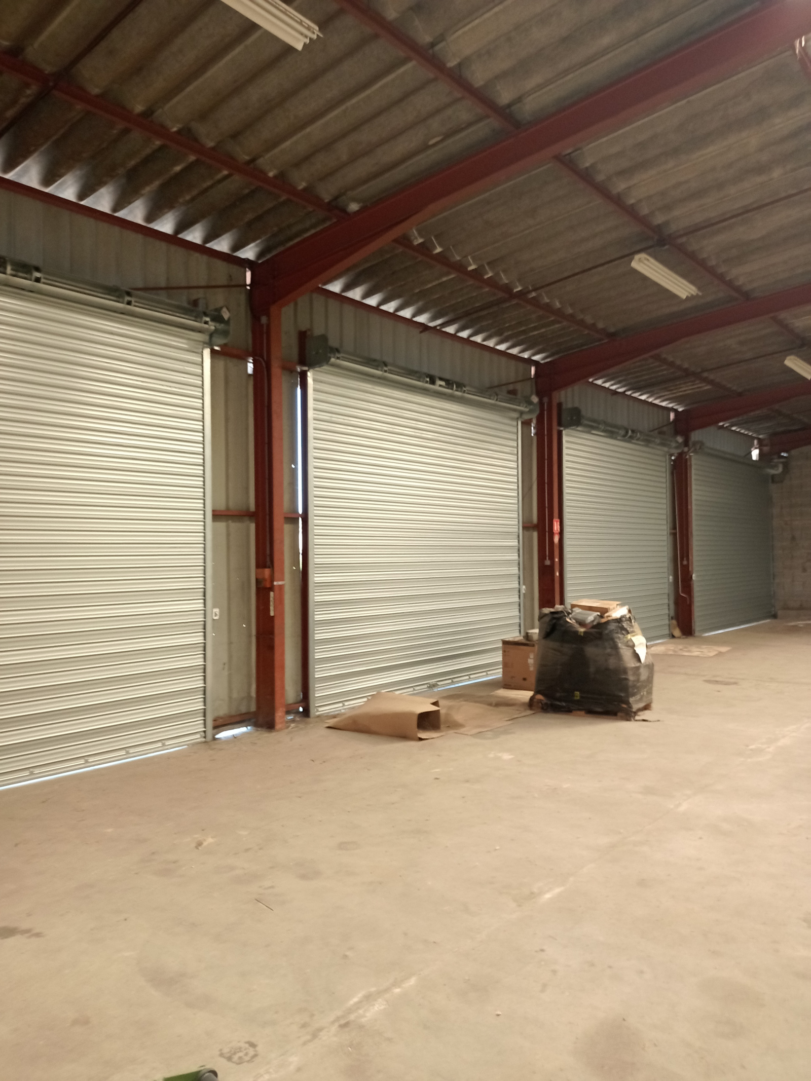 - A droite de la façade : une cellule de 1 100 m² avec 9 portes sectionnelles à manœuvre électrique plus bureaux au rez-de-chaussée et à l’étage de 150 m²,